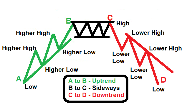 When an uptrend is broken, buyers and sellers even out in strength, and the cycle arcs into a sideways pattern.